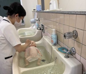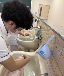 看護師役と母親役に分かれて沐浴をして、看護師役の学生が母親役の学生にわかりやすく沐浴のポイントを伝えることができていました。