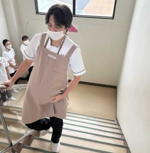 妊婦体験ではお腹が大きくなった状態で、階段の昇り降りをしたり、ベットでの寝返りやベットからの起き上がりを体験しました。