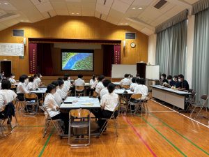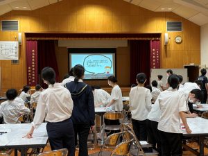 避難所に、高齢者、赤ちゃんを連れての方、外国人、ペット連れの方など様々な方が避難してくる中で、図上で避難所を設計していき、避難所設計図の意図や配慮したこと工夫したことなどを発表しました。